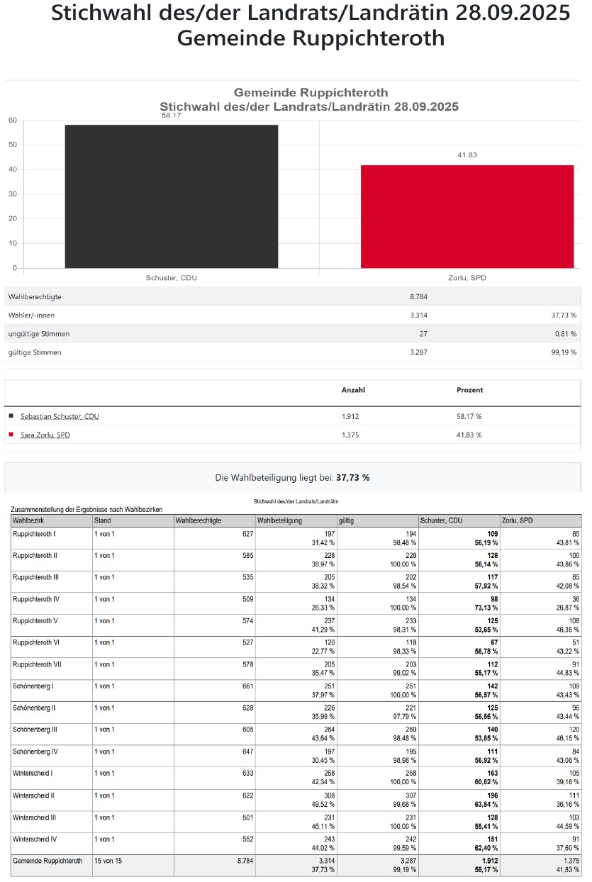 Nachstehend werden die vorläufigen Ergebnisse zur Stichwahl des Landrates / der Landrätin im Rhein-Sieg-Kreis am 28.09.2025 in den einzelnen Wahlbezirken der Gemeinde Ruppichteroth bekanntgegeben.